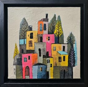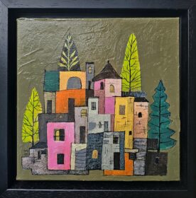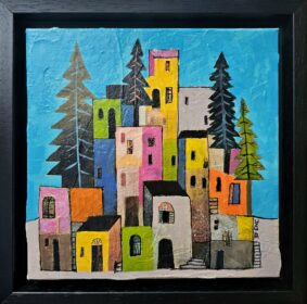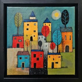 Jelena Mirković Janković ,,Plavi krovovi”, Kombinovana tehnika, dimenzije 20cm×20cm, uramljena 24cm×24cm