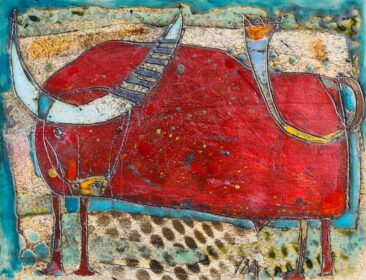 Marija Stanojlović, ,,Crveni bik” Kombinovane tehnike, keramika dimenzije 21cm×27,5cm