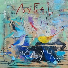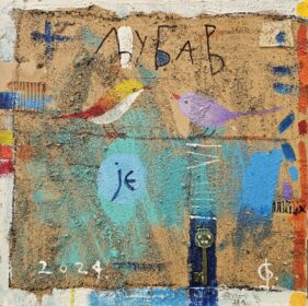 Bojan Savić, ,,Ljubav je ključ”, Kombinovane tehnike, na lesonitu, Dimenzije 35cm×35cm