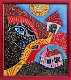 Tanja Đokić, ,,Oko doma” kombinovana tehnika na platnu dimenzije 40cm×35cm, uramljena 44cm×39cm