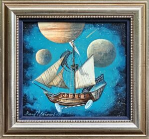 Nenad Stanković, ,,Jedrenjak u kosmosu” ulje na platnu, dimenzije 27cm×29cm, uramljena 39cm×41cm